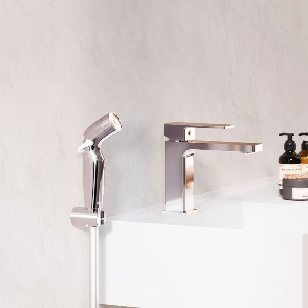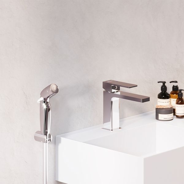 Смеситель для раковины Damixa Gala 530300000 хромКорпус смесителя 1 шт.; Подводка для воды 2 шт.; Комплект крепления 1 компл.; Гигиенический душ 1 шт.; Шланг 1 шт.; Настенный держатель 1 шт.; Инструкция изделия 1 шт. Хромированный, смеситель для раковины, строгие прямоугольные формы, ручной гиг душ с регулировкой напора