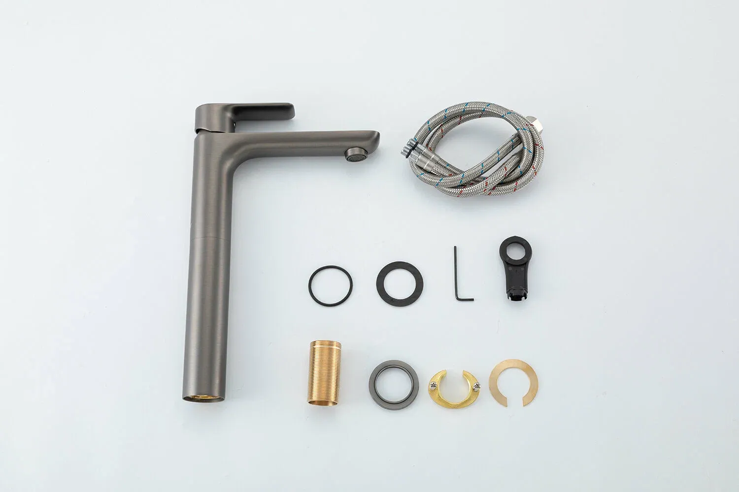 Корпус крана выполнен из высококачественной нержавеющей латуни, что обеспечивает долговечность и надежность в использовании. Высокий смеситель цвета оружейная сталь с прямым изливом гармонично впишется в любой интерьер. Элегантный дизайн смесителя добавит современный и стильный акцент в любую кухню или ванную комнату.