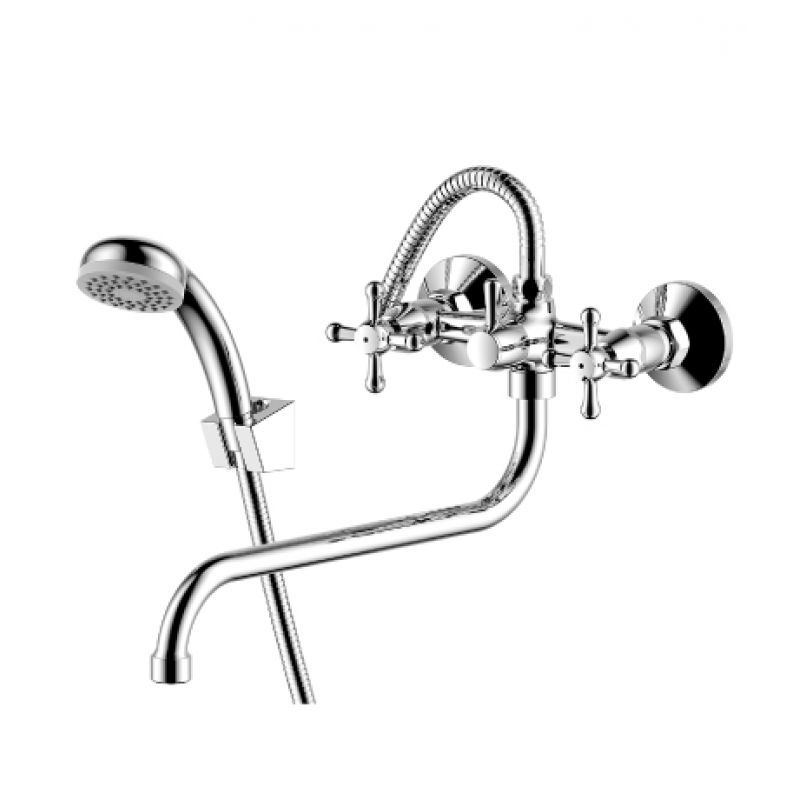 Смеситель Rossinka Y02-82 для ванны с длинным изливом. Аксессуары в комплекте (шланг 1,5 м, настенное крепление, 1-функциональная лейка с функцией легкой очистки).