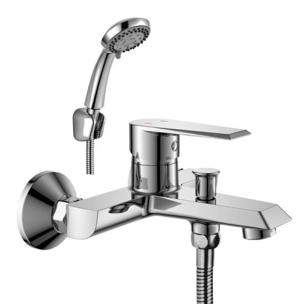 Смеситель для ванны Rossnika RS28-31 с монолитным изливом. Пластиковый аэратор с функцией легкой очистки, керамический картридж 35 мм, кнопочный переключатель, аксессуары в комплекте (шланг 1,5 м, настенное крепление, 5-функциональная лейка с функцией легкой очистки), присоединительная группа (эксцентрики с отражателями) для вертикального крепления, металлическая рукоятка