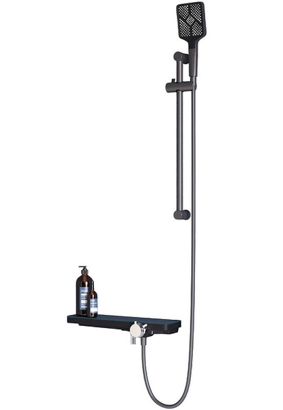В футуристическом дизайне: корпус изделий выполнен в виде вместительной и удобной полки для душевых принадлежностей, а наличие удлиненного поворотного излива с шарнирным соединением позволяет регулировать направление воды, для максимального комфорта в процессе использования.