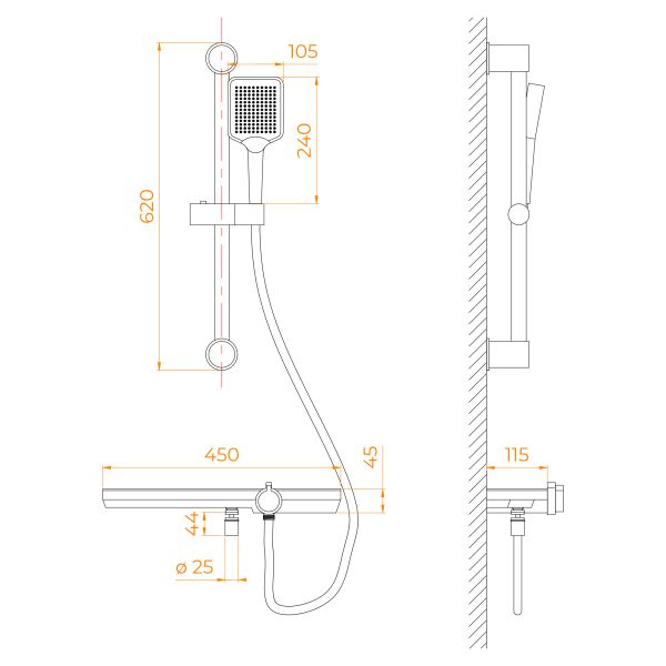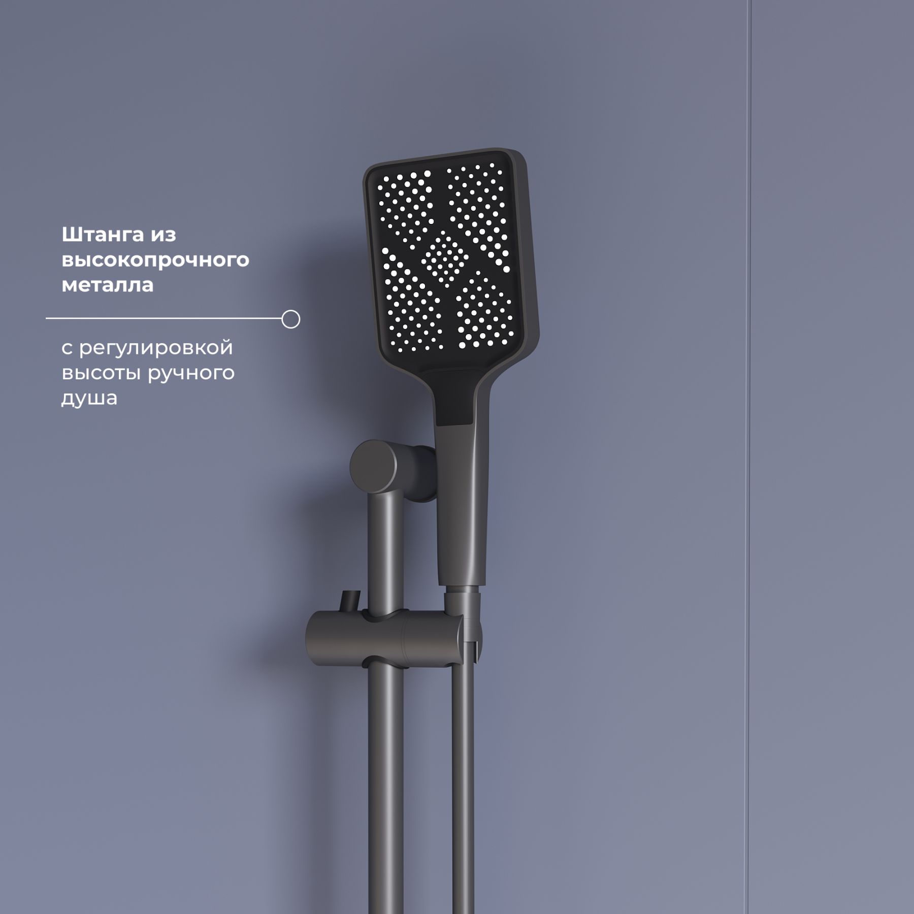 • Металлическая штанга с регулировкой высоты держателя ручного душа;