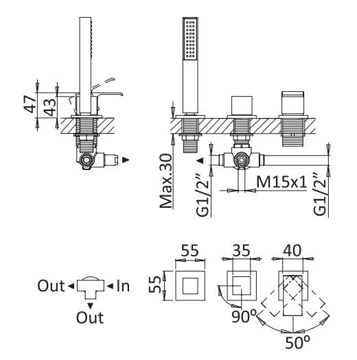 Оснащение: душевой шланг, душевая лейка, крепления, гибкая подводка, дивертор