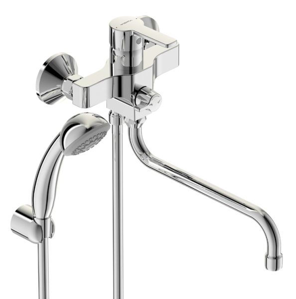 UNO Настенный смеситель для ванны/душа, поворотный излив 250 мм, душевой гарнитур в комплекте (душевая лейка 70 мм, металлический шланг 1500 мм, держатель для лейки).Смеситель однорычажный