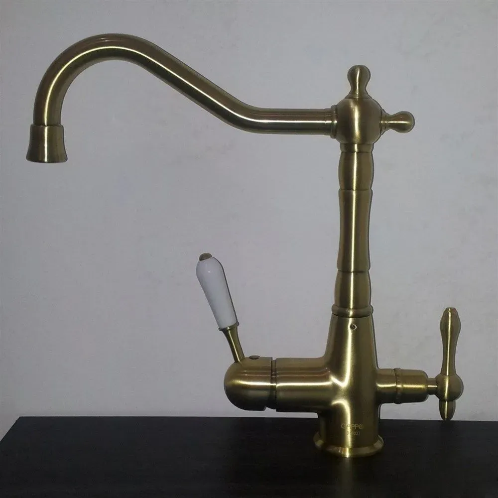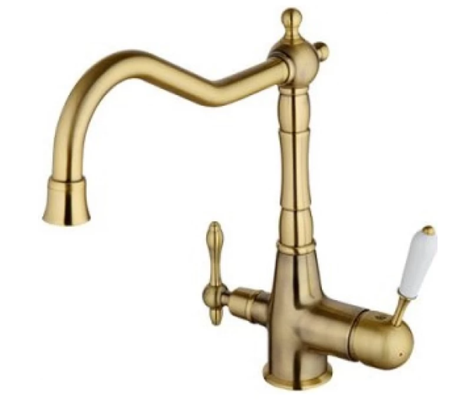 Cмеситель для кухонной мойки Gappo G4391-4 с подключением фильтра питьевой воды - однорычажный смеситель в ретро-стиле, с высоким поворотным изливом и отдельным краном для фильтрованной воды. Изделие изготовлено из латуни с отделкой "бронза". Подключается к системе очистки воды.