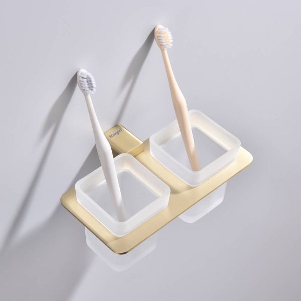 Дизайн: Держатель выполнен в цвете золотой сатин, что придает ему современный и элегантный вид. Лаконичный дизайн стаканов гармонично сочетается с любым интерьером ванной комнаты.