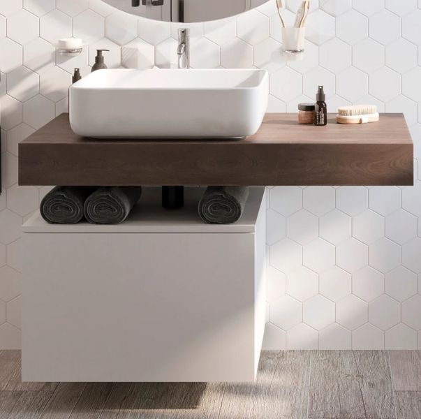 Столешница STWORKI Ольборг 100 дуб карпентер, без отверстий, с тумбой 60, с раковиной STWORKI Soul 1 белой