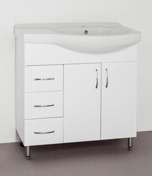 Тумба напольная бренда "Style Line" Эко Стандарт 25 с 3 ящиками. Фурнитура - хром, эксклюзивный декор "Луино" - ламинация внутренней стороны изделия. Направляющие полного выдвижения Hettich; сборка изделия с помощью эксцентриковых стяжек Hafele; все материалы полностью влагостойкие. Данная тумба предусматривает открытую подводку воды