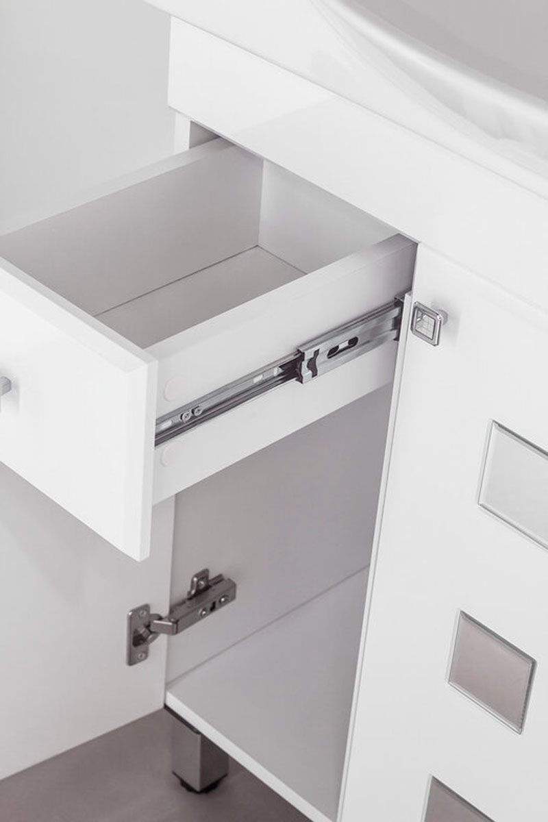 Тумба напольная "Крокус" с декоративными зеркальными вставками на фасаде,края которых обработаны фацетом. Фурнитура - хром, ручки "мозаика", петли на дверцах с механизмом плавного закрывания. Направляющие полного выдвижения Hettich, обеспечивающие плавность и бесшумность хода, высокую надежность и прочность. Данная тумба предусматривает открытую подводку воды