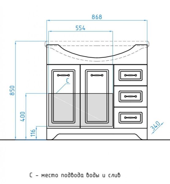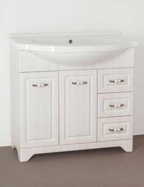 Тумба напольная бренда "Style Line" коллекции "Олеандр-2" классического дизайна, декорированная ручками с керамическими вставками "под бронзу" с изящным рисунком. Направляющие полного выдвижения Hettich; сборка изделия с помощью эксцентриковых стяжек Hafele; все материалы полностью влагостойкие. Данная тумба предусматривает открытую подводку воды
