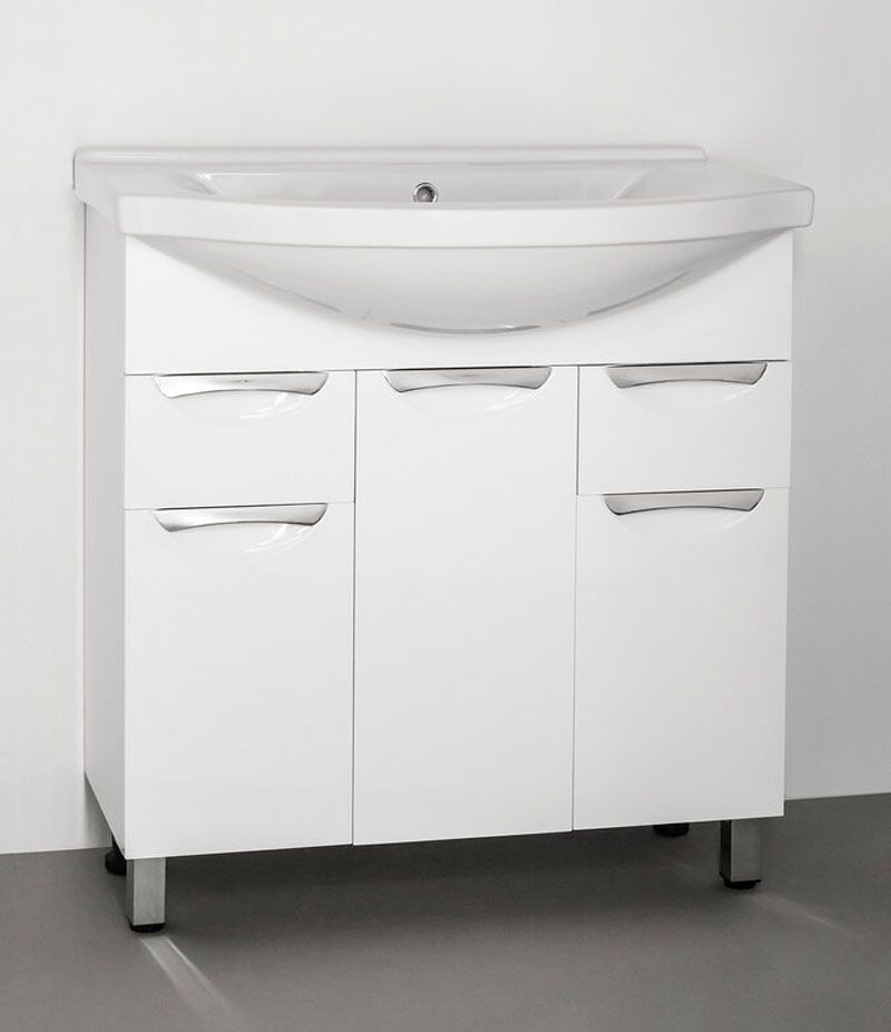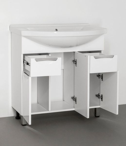 Тумба напольная бренда "Style Line" коллекции "Жасмин" со стильными врезными ручками. Фурнитура - хром, направляющие полного выдвижения Hettich; сборка изделия с помощью эксцентриковых стяжек Hafele; все материалы полностью влагостойкие. Данная тумба предусматривает открытую подводку воды