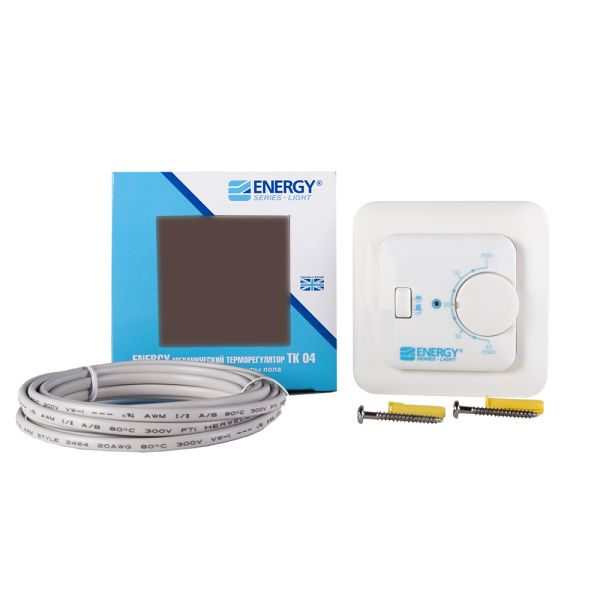 Электромеханический терморегулятор Energy ТК04 предназначен для утопленного скрытого монтажа в стандартную стенную коробку. В комплект входит выносной датчик температуры поверхности пола типа NTC.Установка температуры производится регулировочным диском на лицевой части корпуса. Диапазон устанавливаемых температур: от 0°С до +40°С. Точность регулировки 0,5 °С сокращает время работы терморегулятора на 2-4 часа в день и позволяет экономить электроэнергию.Светодиодный индикатор на передней панели прибора загорается, когда температура поверхности пола опускается ниже заданного значения, при этом осуществляется нагрев. Когда температура достигает установленного на регуляторе уровня, светодиод гаснет и нагрев отключается. Светодиод позволяет визуально контролировать работу терморегулятора.Класс защиты IP 21. Подходит для помещений с повышенной влажностью. При необходимости устройство отключается с помощью кнопочного выключателя на передней части корпуса.
