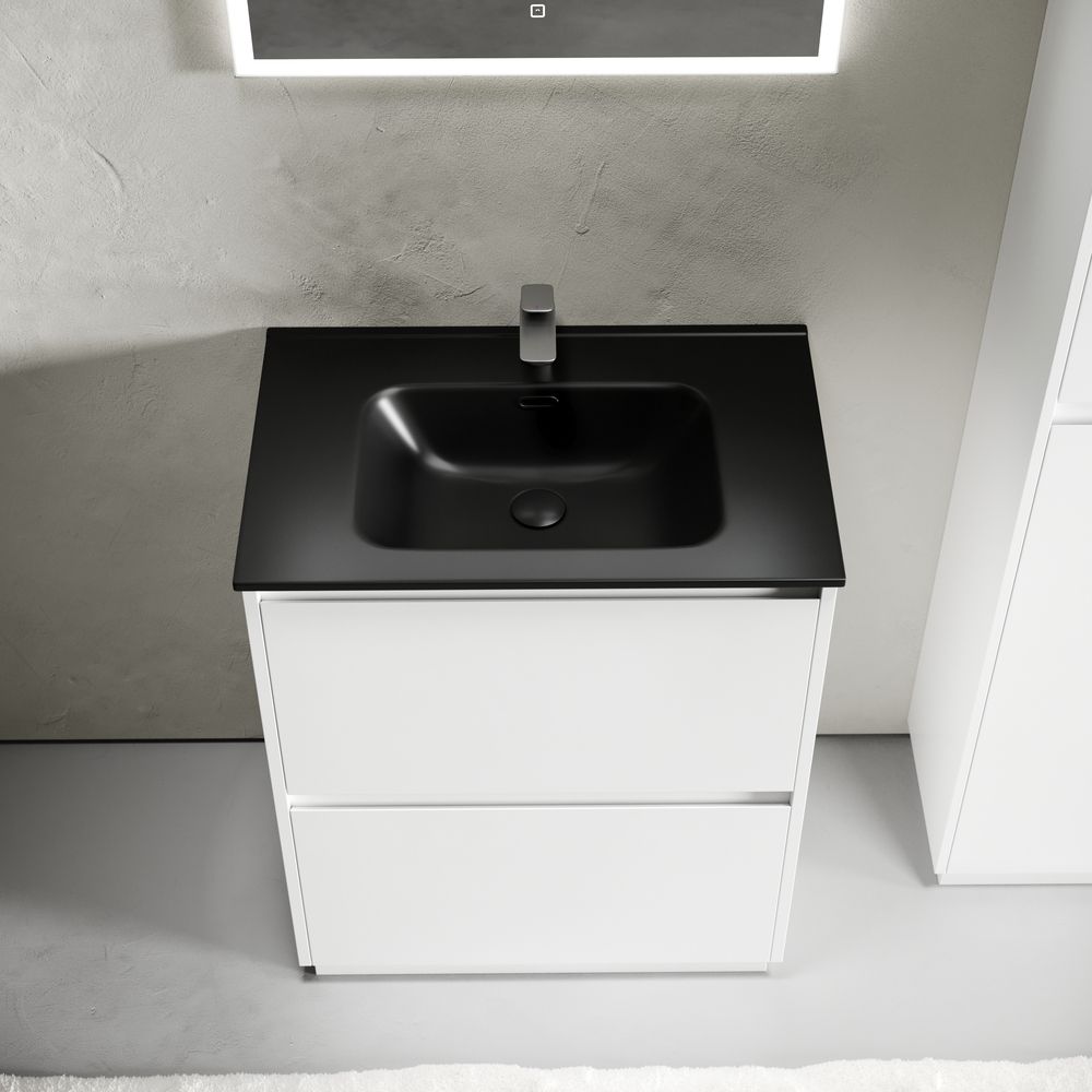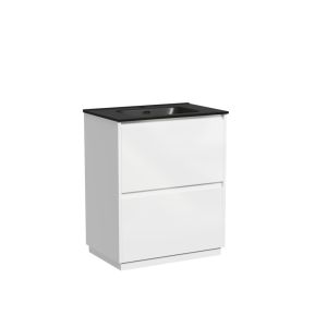 Тумба напольная Libra c двумя ящиками с доводчиками скрытого монтажа, с системой плавного закрывания и с ручкой по всей длине ящика. Каркас и фасад тумбы выполнен из МДФ, покрытие эмаль, цвет белый глянец. Основание тумбы имеет ножки c регулировкой высоты до10 мм для компенсации возможной неровности напольного покрытия. Внутреннее пространство тумбы выполнено из надежного ЛДСП серого цвета. Размер 690х450х840, артикул LB70FW.