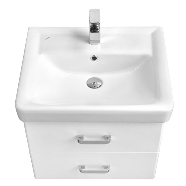 Стильная лаконичная модель, комплектуется прямоугольной керамической раковиной с широкой удобной чашей. В тумбе установлены два ящика, изготовленные из декоративной влагостойкой ДСП. Нижний ящик тумбы – широкий и вместительный – предназначен для крупных предметов, а в верхнем имеется специальная организация пространства, позволяющая хранить мелкие вещи.