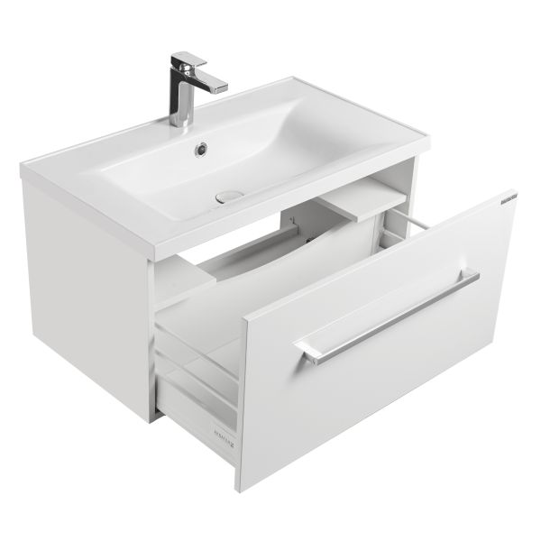 Центром коллекции является тумба, которая комплектуется раковиной из литого мрамора. Тумба выпускается с выдвижным ящиком, оснащенным системой плавного закрывания и антискользящим ковриком. Тумба дополнительно оснащена полочками с рейлингом, расположенными над ящиком.