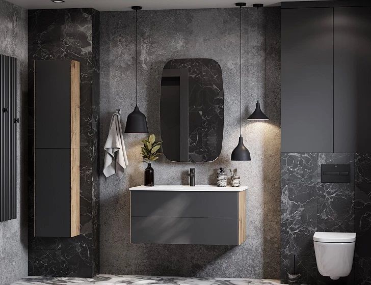 Тумба Сохо 100 функционально состоит из двух вместительных ящиков, оснащенных системой push to open, обеспечивающей надежное, комфортное и бесшумное закрывание. Фасады изделия – МДФ в пленке графит с эффектом soft touch, корпус – ламинированная влагостойкая ДСП Дуб веллингтон. Верхний и нижний ящики оснащены системой организации пространства, которая позволяет содержать косметические средства в идеальном порядке. Дополняет тумбу стильная раковина Элина от бренда Santek с удобной чашей. Все внутренние детали тумбы выполнены в тон фасадов – цвета антрацит