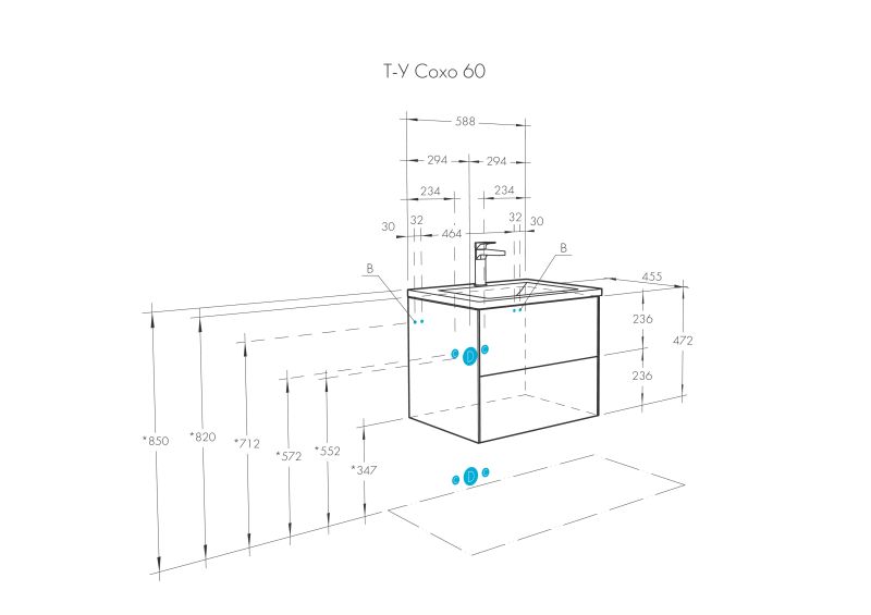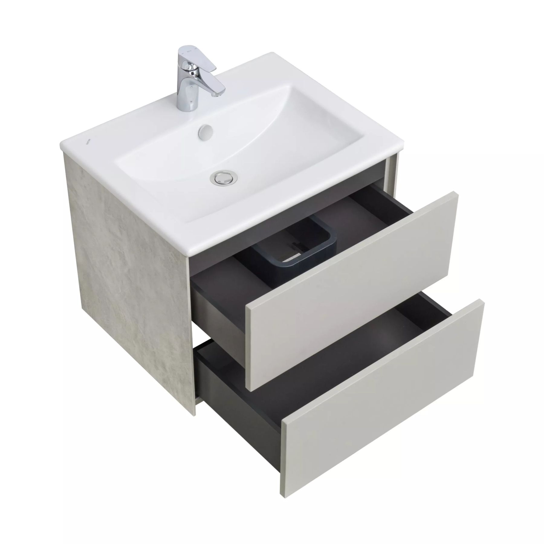 Тумба Сохо 60 функционально состоит из двух вместительных ящиков, оснащенных системой push to open, обеспечивающей надежное, комфортное и бесшумное закрывание. Фасады изделия выполнены из МДФ в пленке в цвете галька серая, корпус из ламинированной влагостойкой ДСП слэйт. Верхний и нижний ящики оснащены системой организации пространства, которая позволяет содержать косметические средства в идеальном порядке. Дополняет тумбу стильная раковина Элина от бренда Santek с удобной чашей. Все внутренние детали тумбы выполнены в цвете антрацит.