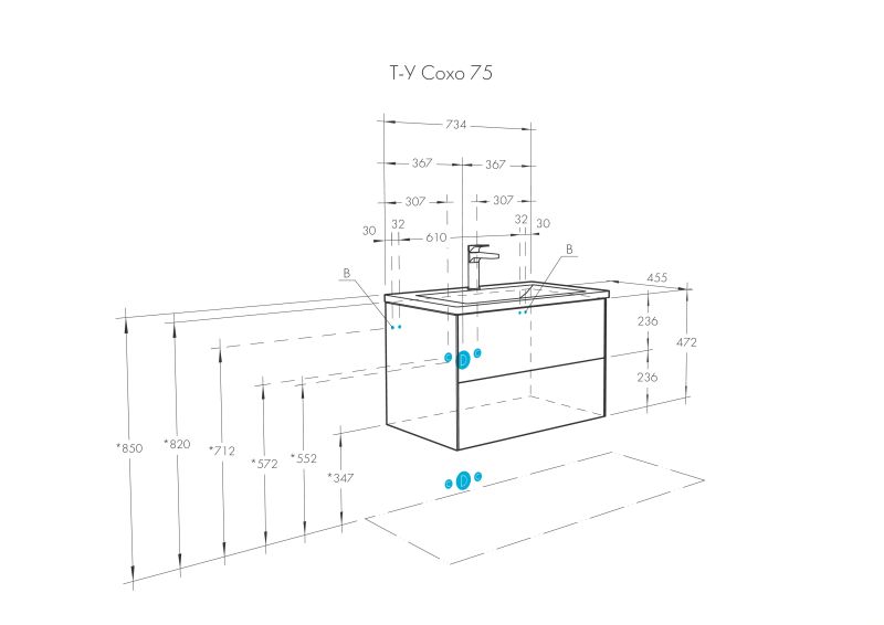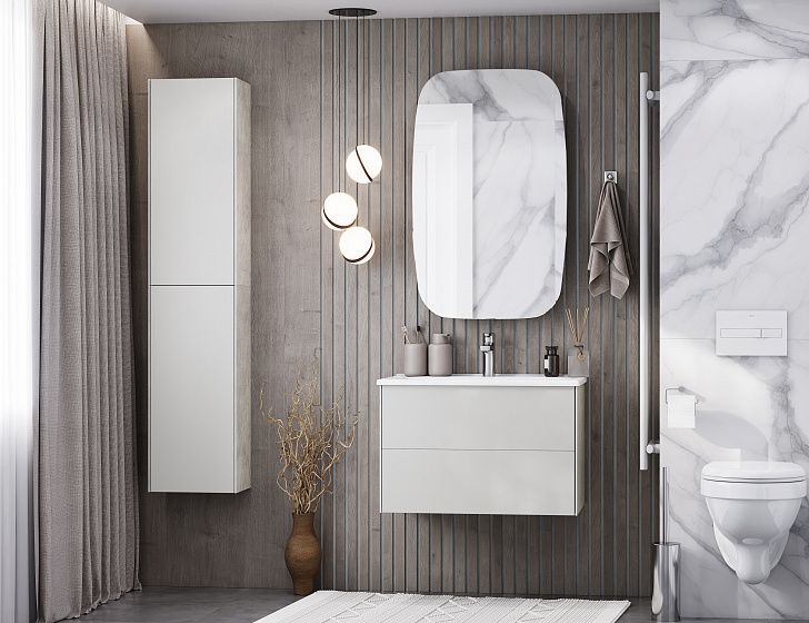 Тумба Сохо 75 функционально состоит из двух вместительных ящиков, оснащенных системой push to open, обеспечивающей надежное, комфортное и бесшумное закрывание. Фасады изделия выполнены из МДФ в пленке в цвете галька серая, корпус из ламинированной влагостойкой ДСП слэйт. Верхний и нижний ящики оснащены системой организации пространства, которая позволяет содержать косметические средства в идеальном порядке. Дополняет тумбу стильная раковина Элина от бренда Santek с удобной чашей. Все внутренние детали тумбы выполнены в цвете антрацит.
