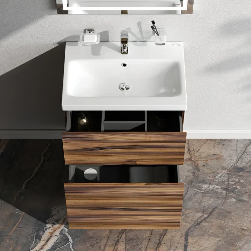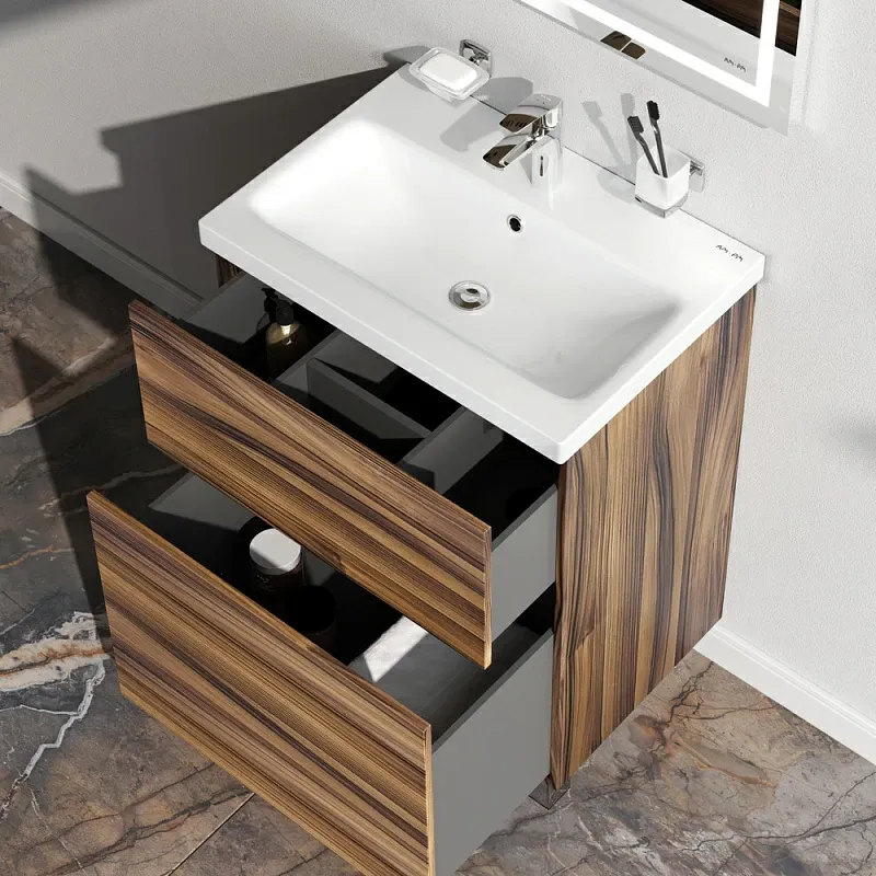 Тумба под раковину Am.Pm Gem M90FSX0602HF напольная на ножках орех 60 смНапольная тумба бренда AM.PM коллекции Gem изготовлена из влагостойкого ЛДСП. Внутреннее пространство двух вместительных ящиков представлено в цвете "антрацит" с антискользящим эффектом. В верхнем ящике находится удобный органайзер для хранения гигиенических принадлежностей. Благодаря системе отделений органайзера, каждый предмет имеет свое место, что обеспечивает порядок и удобство при использовании. Такая система хранения позволяет экономить место и помогает поддерживать чистоту ванной комнаты. Фурнитура push-to-open - открытие ящика легким нажатием на фасад. Направляющие скрытого монтажа обеспечивают плавное выдвижение ящиков. Материал тумбы - влагостойкая ЛДСП. Покрытие фасада и корпуса - ламинат. Размер (Ш/Г/В): 600x408x810 мм. Цвет тумбы – орех.
