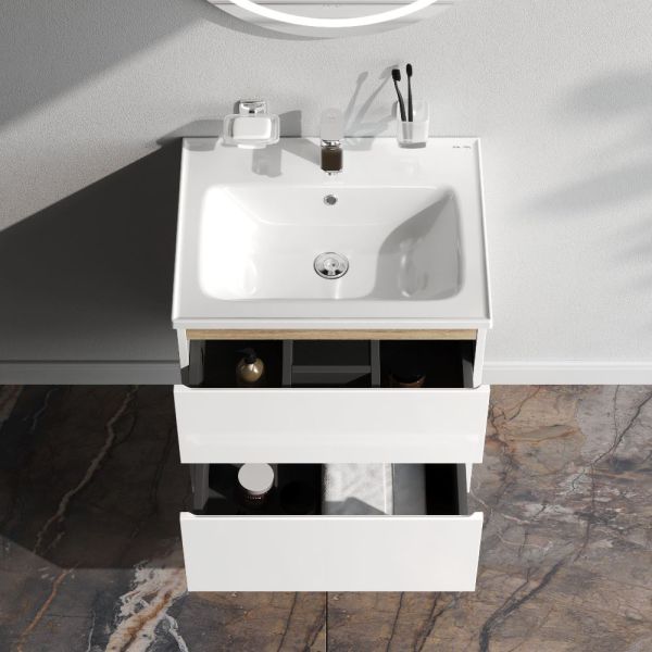 Подвесная тумба бренда AM.PM коллекции X-Joy с белыми глянцевыми фасадами, дополненными отделкой под светлое дерево. Функциональный органайзер в первом ящике позволит хранить необходимые косметические средства под рукой и в полном порядке. Внутреннее покрытие каждого ящика выполнено в современном цвете "антрацит" и имеет противоскользящее покрытие.​ Материал и покрытие корпуса - влагостойкий ЛДСП. Материал фасада - МДФ. Покрытие фасада - высококачественные итальянские краски и эмали. Размер тумбы (Ш/Г/В): 590x450x620. Цвет тумбы - белый глянец.