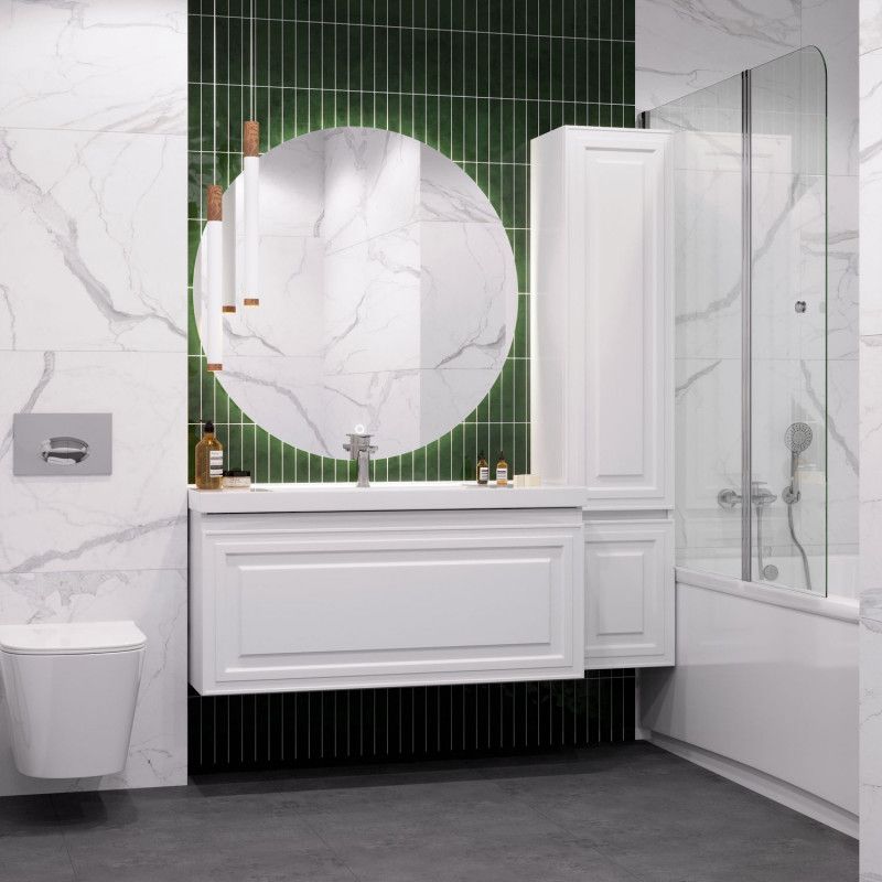 Корпус изготовлен из влагостойкой ЛДСП с покрытием эмаль белый сатин. Фасады выполнены из МДФ с таким же полуматовым покрытием. Эффект "сатин" придает поверхности ровный, слегка мерцающий вид. Такая отделка не только красива, но и практична — она меньше пачкается и проще в уходе по сравнению с матовой эмалью.