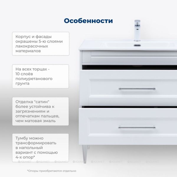 Тумбу можно использовать как навесную или трансформировать в напольную — для этого потребуется дополнительный комплект из 4 опор Бостон new.