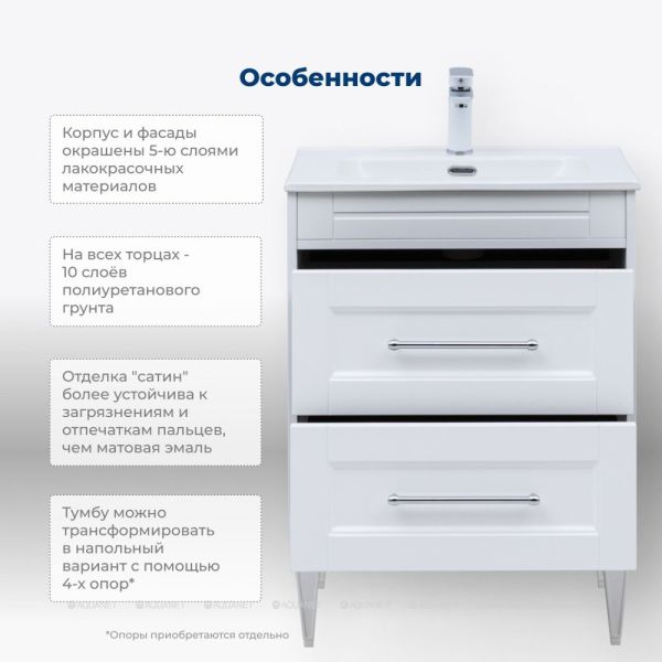 Тумба под раковину Aquanet Бостон new 70 белый сатин Стильная и функциональная тумба под рако... Подробнее