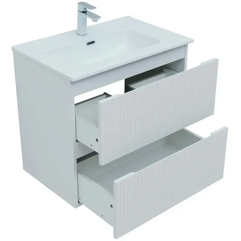 Поверхность бархатистая, устойчивая к царапинам. Внутренние детали выполнены из влагостойкой ЛДСП белого цвета. Дно ящиков прочное, изготовлено из ЛДСП толщиной 16 мм, что обеспечивает долговечность.