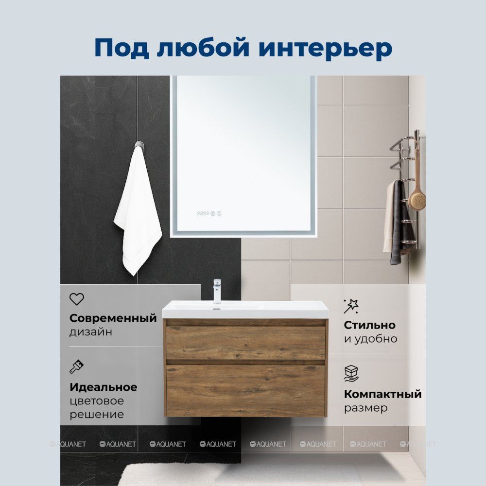 Стильная и практичная тумба для ванной комнаты с продуманной конструкцией. Модель Aquanet Nova Lite 2.0 100 выполнена в цвете дуб рустикальный – матовое покрытие имитирует фактуру натурального дерева и не оставляет отпечатков пальцев.