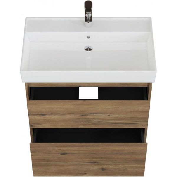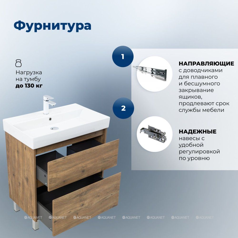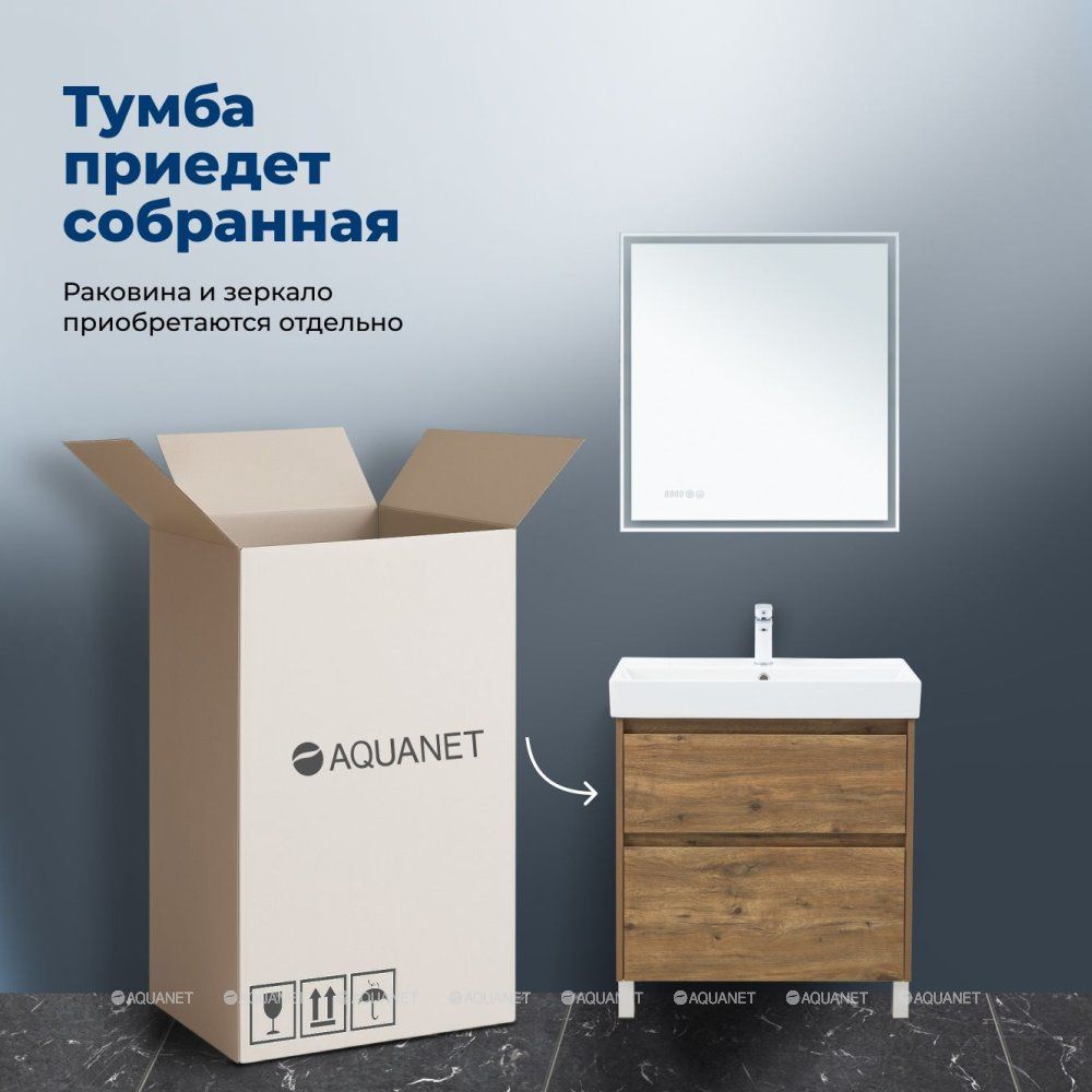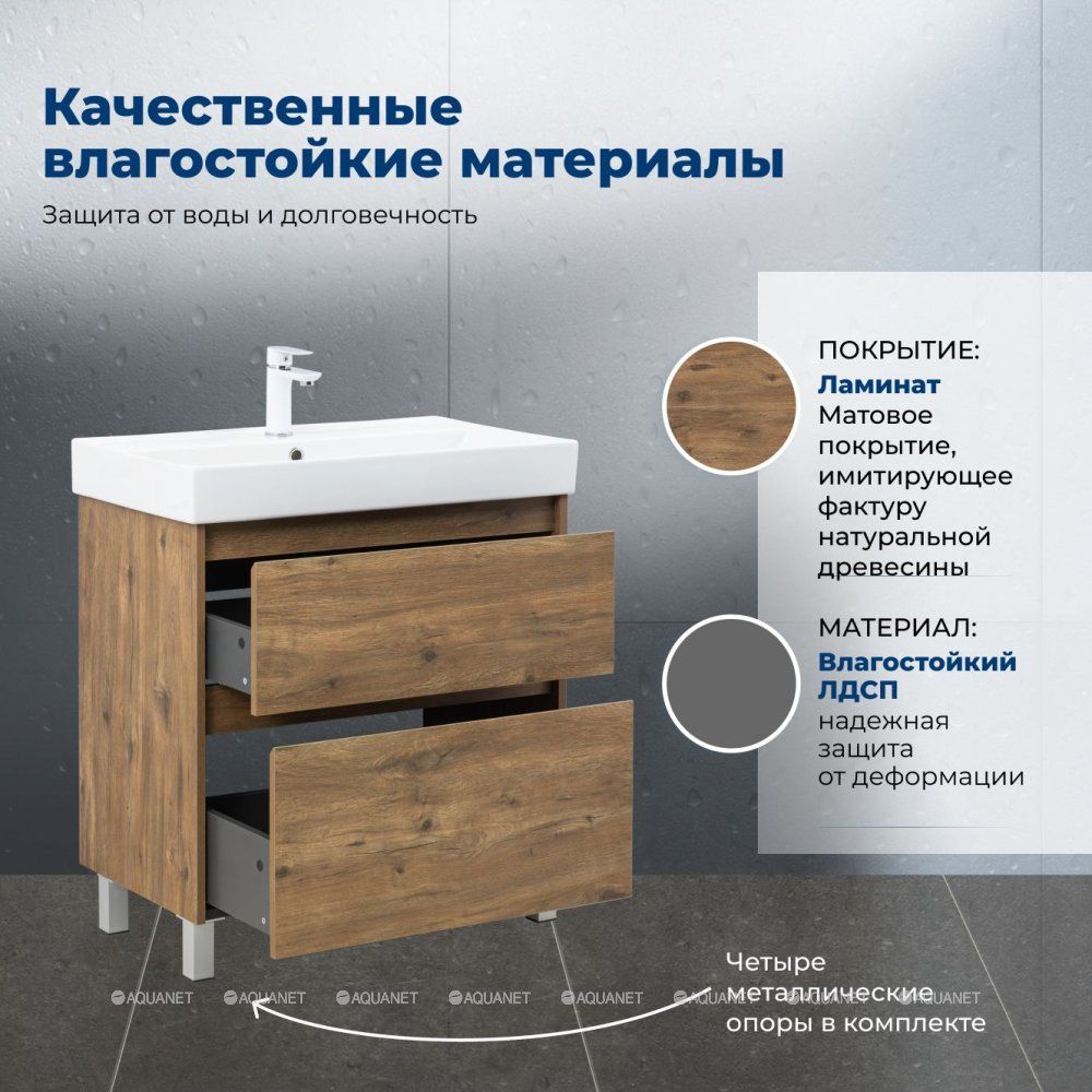 Стильная и практичная тумба для ванной комнаты с продуманной конструкцией. Модель Aquanet Nova Lite 2.0 75 выполнена в цвете дуб рустикальный – матовое покрытие имитирует фактуру натурального дерева и не оставляет отпечатков пальцев.