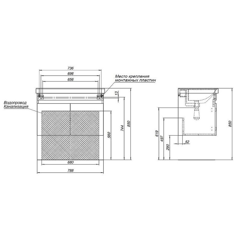 Корпус тумбы выполнен из влагостойкой ЛДСП с ламинированным покрытием, что гарантирует долговечность и устойчивость к воздействию влаги. Фасады также изготовлены из влагостойкой ЛДСП, обеспечивая единый стиль и надежную защиту от деформации.