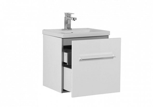 Тумба Aquanet Порто 60 белого цвета отличается стильностью и функциональностью. Внешний ее лаконизм скрывает в себе очень продуманный конструктивизм внутреннего устройства, где невысокий ящик с тремя отделениями скрывается за фасадом основного места хранения, поэтому разместить в этой небольшой на первый взгляд модели шириной 50 см можно много полезных в ванной комнате мелочей, а также найти место для высоких емкостей. Материал фасадов – крашенный белым глянцем влагостойкий МДФ. Для оборудования тумбы использованы петли и доводчики польской фирмы Gamet — одного из крупнейших производителей мебельной фурнитуры и комплектующих в Европе. В этом можно убедиться, оценив качество доводчиков, которые позволяют плавно отодвигать и задвигать ящики, а также убедившись в надежности ручек.