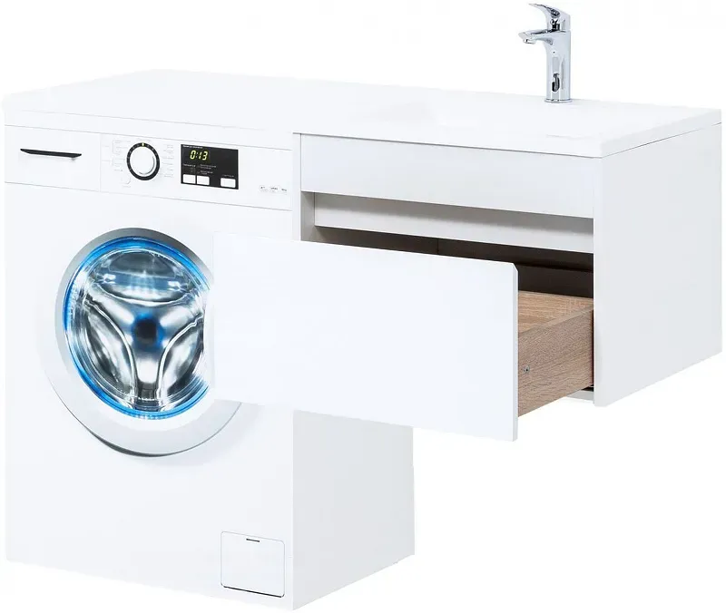 Тумба под раковину Aquanet Токио 120 (подвесная, 1 ящик) белого цвета представляет новый формат тумб производства Aquanet. Раковина из литьевого мрамора имеет длинную платформу, которая выходит далеко за пределы тумбы. Она предназначена для того, чтобы установить с правой стороны от тумбы стиральную машину. Платформа имеет такую длину, которая позволит спрятать под нее машинку средних размеров с фронтальной загрузкой. Корпус тумбы выполнен из влагостойкого ЛДСП, а фасад – из МДФ с покрытием эмалью. В подвесной тумбе шириной 580 мм место хранения предусмотрено в выдвижном ящике, оборудованном доводчиками, чтобы ход ящика при открывании/закрывании был плавным и без неприятных звуков. Тумбу можно использовать и без соседства со стиральной машиной, а свободное пространство под платформой раковины занять подкатной тумбой, полочками для полотенец или столиком. Тумба предлагается без раковины