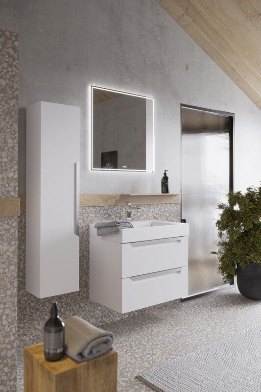 Подвесная тумба в белом матовом цвете с двумя ящиками под умывальник из литьевого мрамора.Коллекция мебели Cube – это строгие линии мебели для современных интерьеров, подчёркнутые искусным исполнением. Подвесные гарнитуры Cube поставляются в размерах 70 и 90 см. Доступные цвета мебели – белый и серый. Финальный слой лака – матовый.