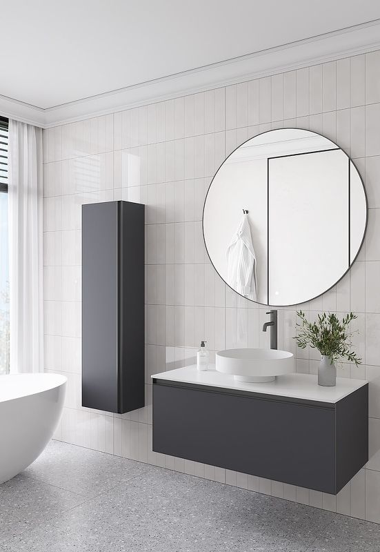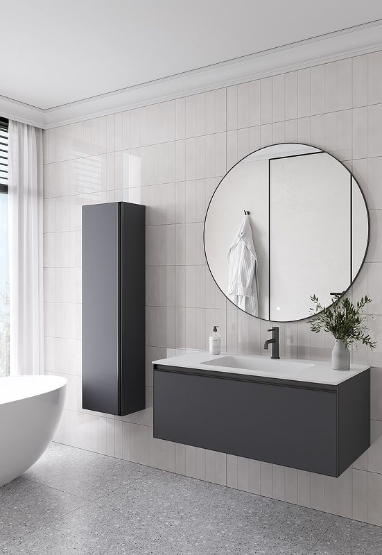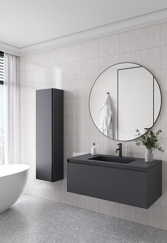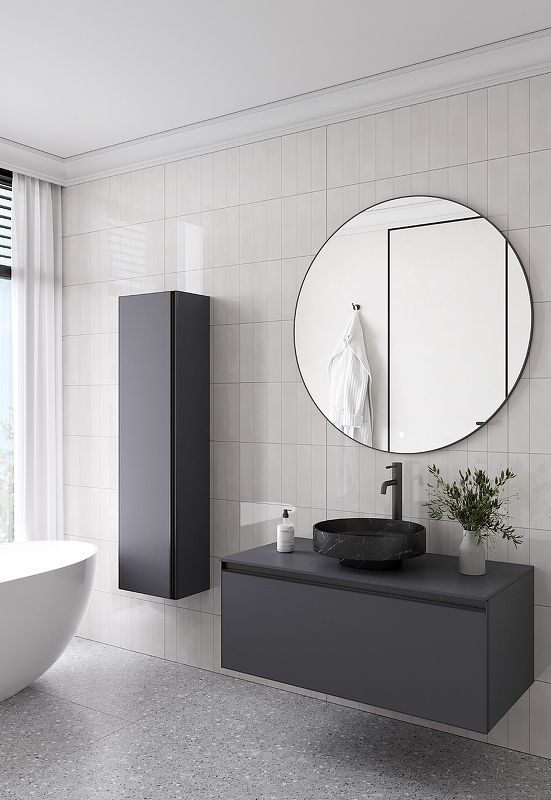 Главной особенностью коллекции являются обрамления фасадов из алюминия в самых трендовых цветах: графит, матовое золото, матовый черный и серебро. Эти обрамления идеально дополняют сантехнику в ванной комнате.
