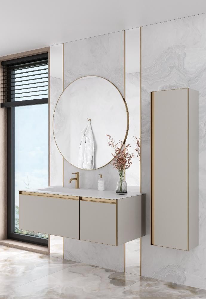 Главной особенностью коллекции являются обрамления фасадов из алюминия в самых трендовых цветах: графит, матовое золото, матовый черный и серебро. Эти обрамления идеально дополняют сантехнику в ванной комнате.