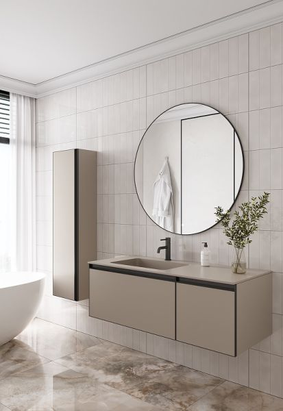 Главной особенностью коллекции являются обрамления фасадов из алюминия в самых трендовых цветах: графит, матовое золото, матовый черный и серебро. Эти обрамления идеально дополняют сантехнику в ванной комнате.