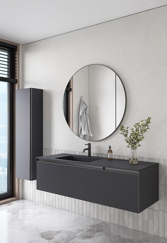 Главной особенностью коллекции являются обрамления фасадов из алюминия в самых трендовых цветах: графит, матовое золото, матовый черный и серебро. Эти обрамления идеально дополняют сантехнику в ванной комнате.