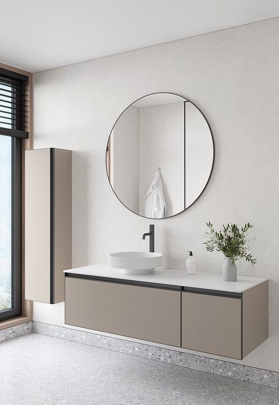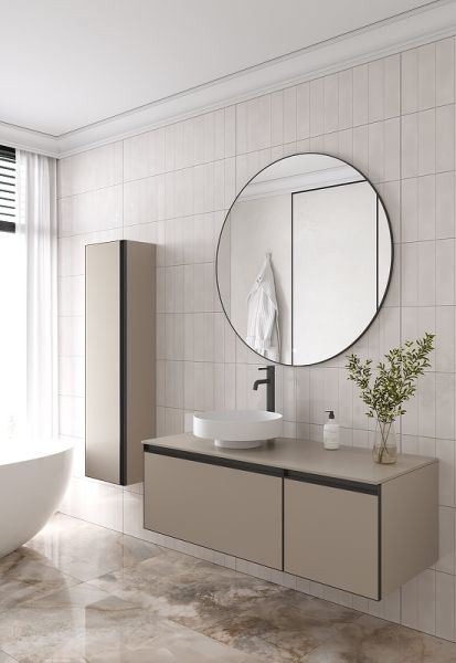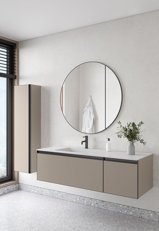 Главной особенностью коллекции являются обрамления фасадов из алюминия в самых трендовых цветах: графит, матовое золото, матовый черный и серебро. Эти обрамления идеально дополняют сантехнику в ванной комнате.