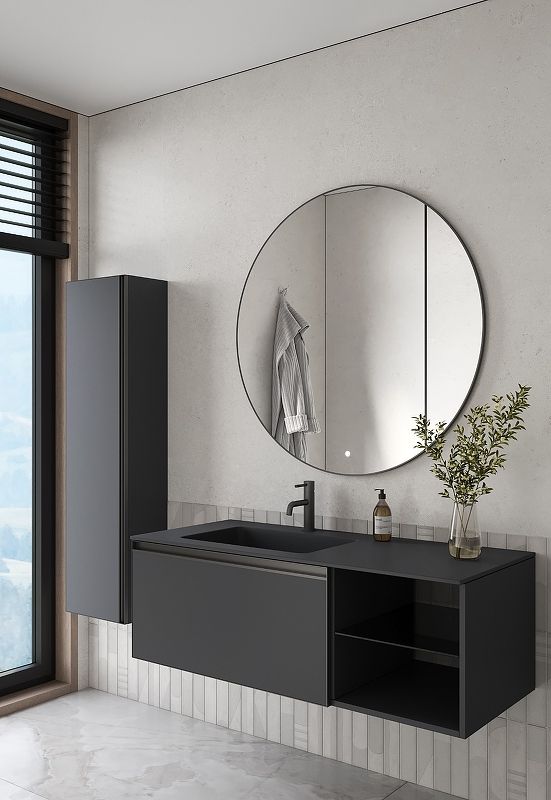 Главной особенностью коллекции являются обрамления фасадов из алюминия в самых трендовых цветах: графит, матовое золото, матовый черный и серебро. Эти обрамления идеально дополняют сантехнику в ванной комнате.