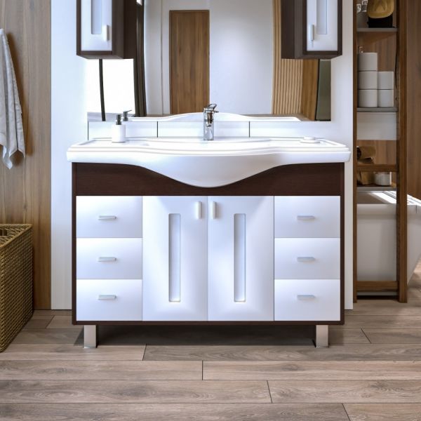 Удобная система хранения позволяет размещать все необходимое для гигиенических процедур, а её продуманные размеры отлично вписываются даже в небольшие помещения. Стильные ручки и элегантные фасады придают тумбе особый шарм, а разнообразие цветовых решений позволит выбрать модель, соответствующую любому интерьеру – от классического до модерн.