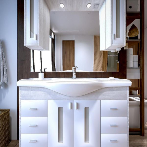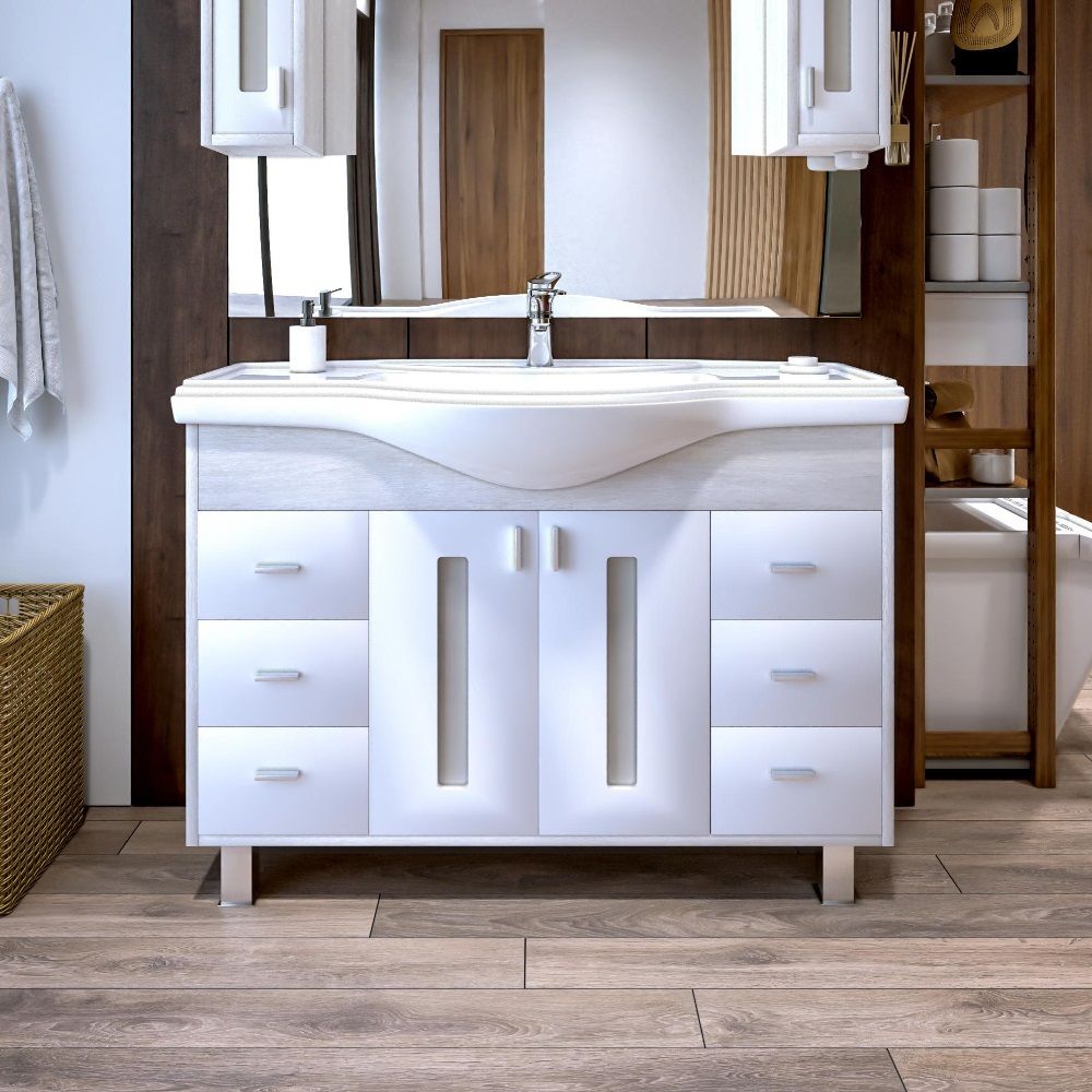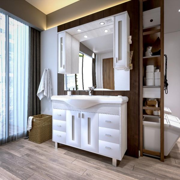 Удобная система хранения позволяет размещать все необходимое для гигиенических процедур, а её продуманные размеры отлично вписываются даже в небольшие помещения. Стильные ручки и элегантные фасады придают тумбе особый шарм, а разнообразие цветовых решений позволит выбрать модель, соответствующую любому интерьеру – от классического до модерн.
