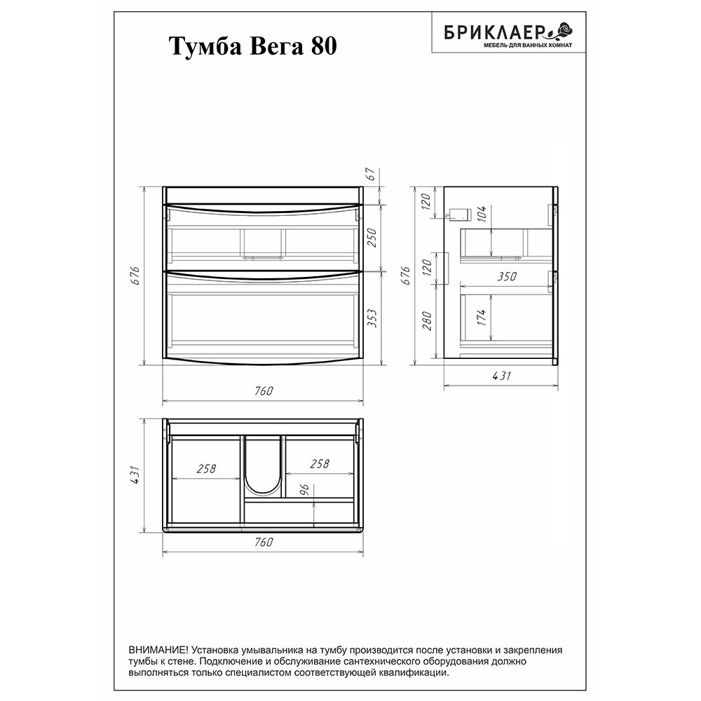 Тумба под раковину Бриклаер Вега 4627125414077 с двумя ящиками 80 см белый купить