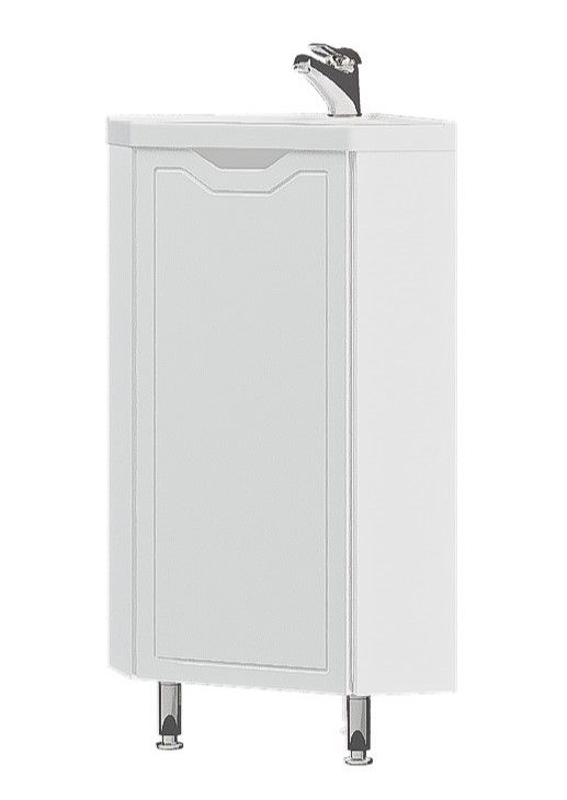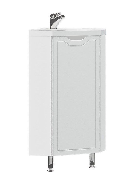 Тумба под раковину Corozo Мирра 40, напольная, белая, SD-00001642Коллекция мебели для ванных комнат МИРРА - подходящий вариант для тех, кто предпочитаетлегкое, гармоничное пространство, полное спокойствия и умиротворения. Данная коллекция позволит рационально использовать угловое пространство в ванной комнате. Тумба угловая, оснащена одной распашной створкой, позади дно. Тумба стоит на 2 металлических опорах и 1 пластиковой. Корпус ЛДСП белый, фасады МДФ в белой плёнке ПВХ. Корпус мебели выполнен в цвете «Белый глянец». Ручки на фасадах отсутствуют, вместо них предусмотрены интегрированные ручки и декоративная фрезеровка по периметру фасада. Бесшумность и длительный цикл эксплуатации обеспечивают петли с доводчиком.