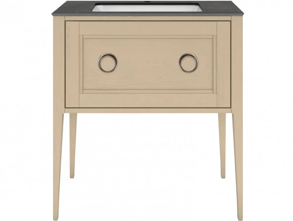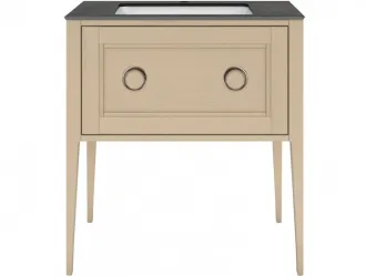 Напольная тумба с одним выдвижным и одним внутренним ящиками выполнена из массива ясеня с отделкой «открытая пора». Вместительный ящик с плавным закрыванием украшен двумя крупными ручками. Сочетается с керамическими столешницами PLAZA Classic шириной 80 см. Подходит для установки раковин с типом монтажа «накладная на столешницу» и «встраиваемая сверху».