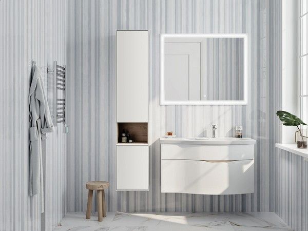 Белая матовая тумба с гнутым фасадом с правым расположением овальной зоны, ширина 100 см. Внутренняя планка окрашена в песочный цвет. Тумба представлена в версии с двумя ящиками, снабжена врезными удобными ручками, которые образуют на фасаде изящную «улыбку». Благодаря смещенному сливу раковины, верхний ящик не имеет вырез под сифон. Сочетается с раковиной Riva с правым расположением чаши.