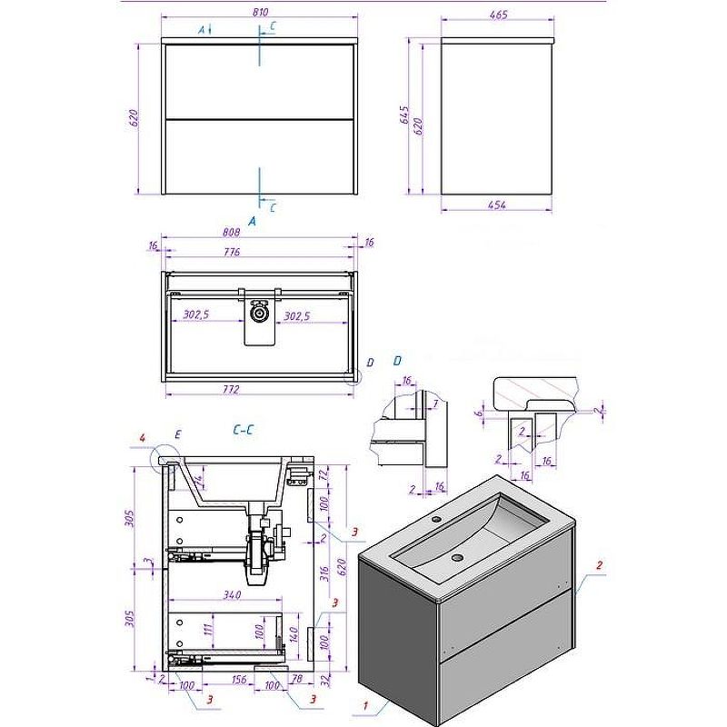 Габариты корпуса тумбы (ШхВхГ): 808х620х454 мм.
