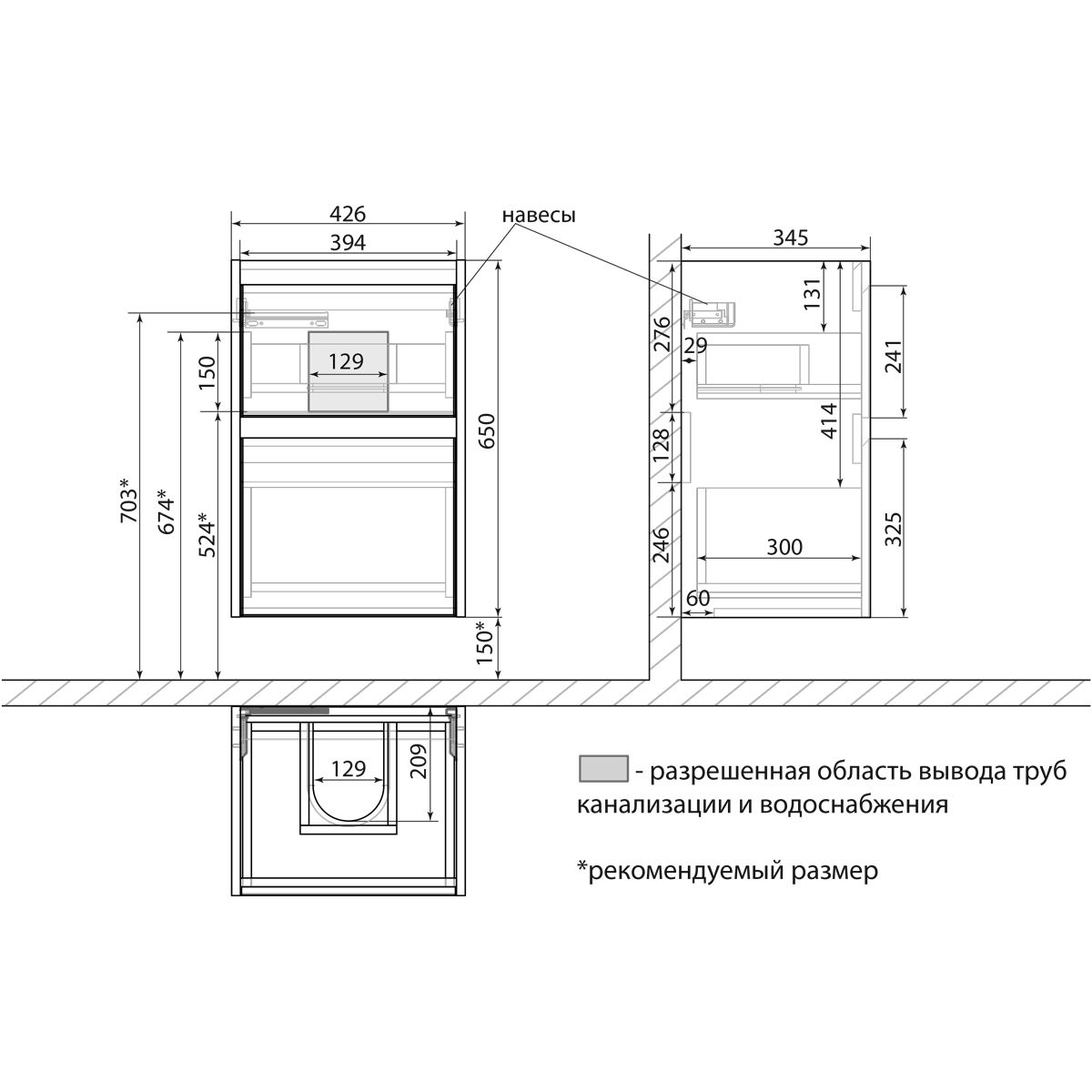 • Габариты без раковины (ШГВ): 426х345х650 мм;