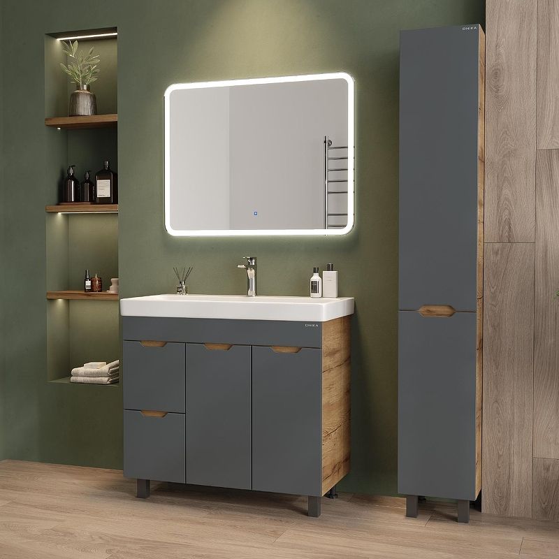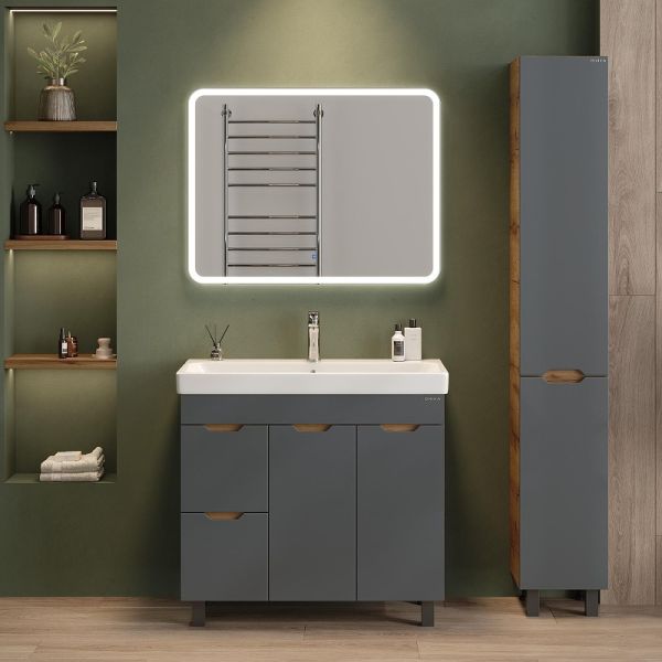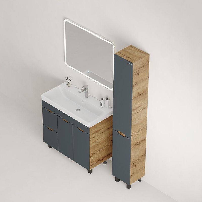 Тумба впишется в любой интерьер благодаря трендовому сочетанию матового графита и золотого дуба, а также поможет эффективно организовать пространство, что особенно важно в небольших ванных комнатах.
