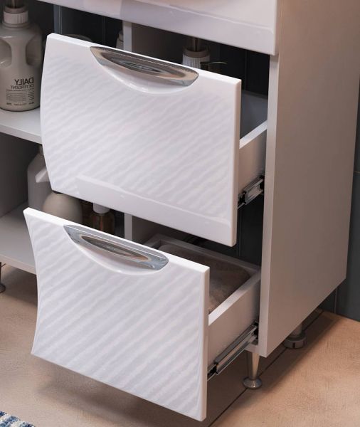 1 дверца; 2 ящика; 1 полка ЛДСП; ручка металлическая хромированная; опоры конус регулируемые.